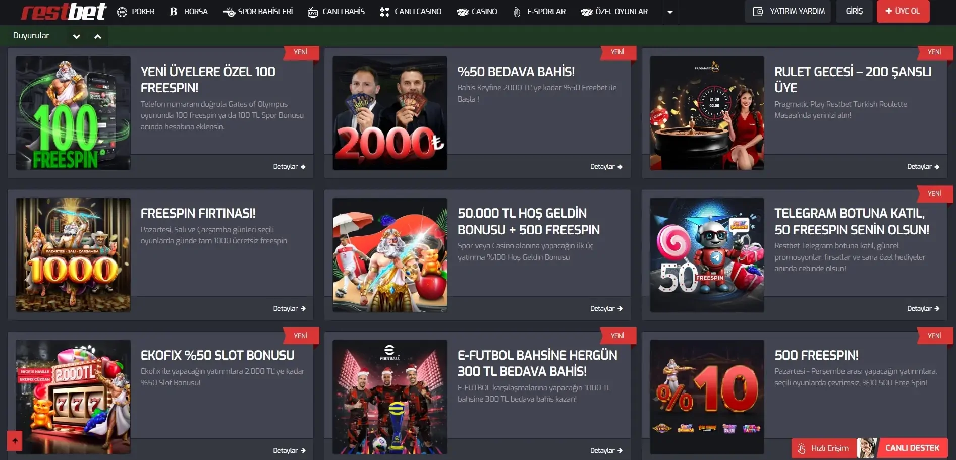 Eski ve ilk adresi Restbet.com olan site, hizmetlerini artık Restbet güncel giriş adıyla sürdürmektedir. Güvenilir bahis ve casino deneyimi arayan kullanıcılar için bahse konu yeni adres doğru bir tercih sunar. Güçlü altyapısı ve kesintisiz erişim yapısıyla sizleri karşılıyor. Bahis deneyiminizi ertelemeyin, hemen giriş yapın!